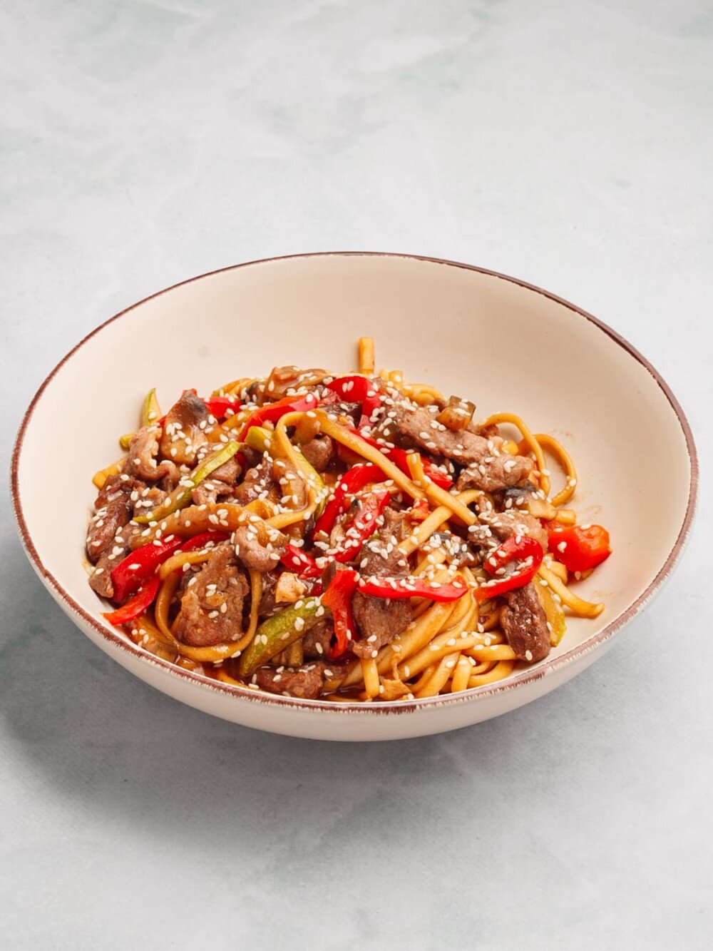 Говядина вырезка, лапша удон, цукини, красный болгарский перец, баклажан, шампиньоны, соус терияки, кунжут.