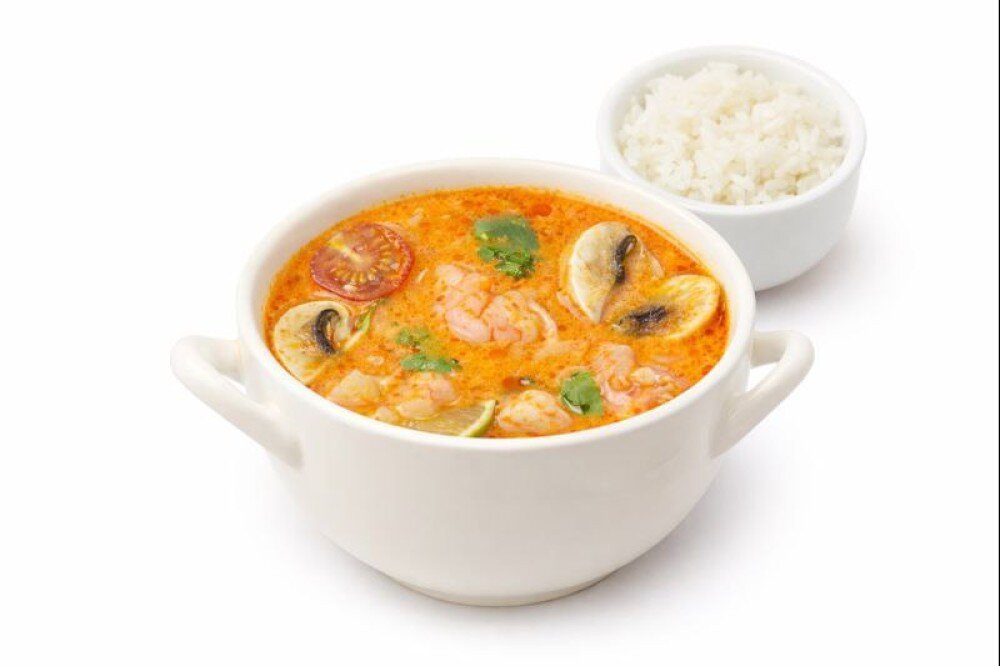 Креветка, кальмар, миди, рис, шампиньоны, томат черри, перец чили, куриный бульон, кокосовое молоко, лемонграсс, сок лимон , сахар, кунжут, кинза , специи.