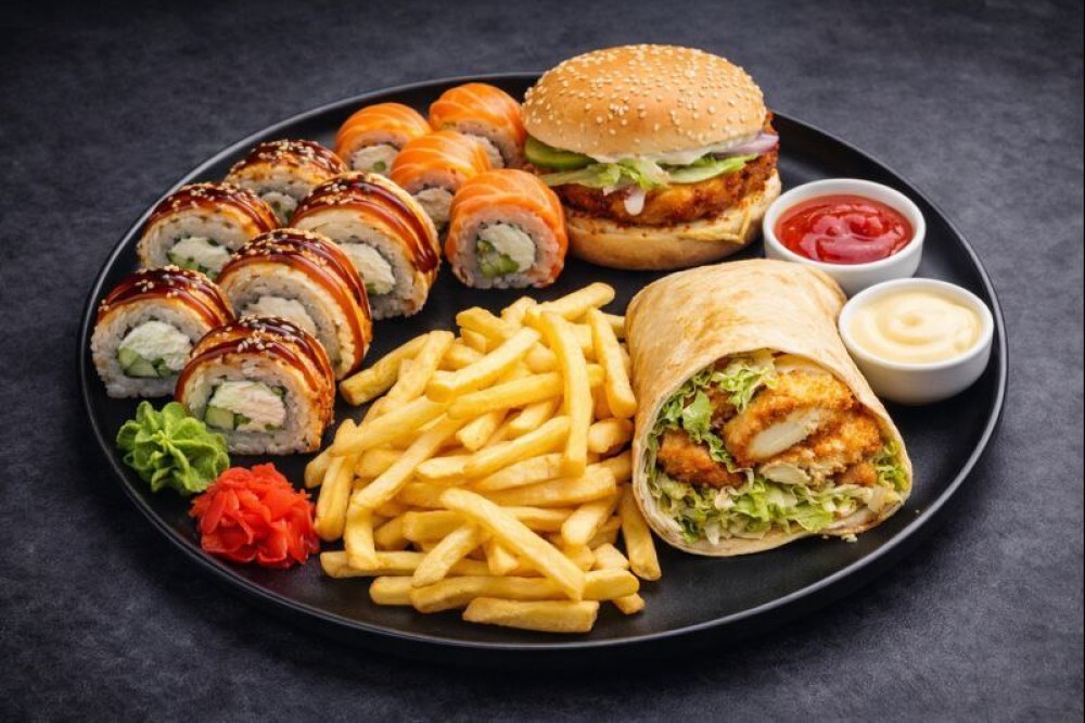 Ролл «Филадельфия 8 ш т" Филадельфия с угрём 8 ш т" Чизбургер куриный" Гирос цезарь с курицей " Фри" Соус кисло-сладкий , соус сырный , васаби , имбирь, соевый соус, палочки .