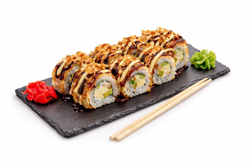 Рис, сливочный сыр, филе гудка, водоросли нори, соусы сырный , соус барбекю ,